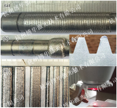 a: 轴类零件熔覆 b:轴类零件增材制造 c:齿类零件修复 d:平板激光熔覆 e: 工作现场